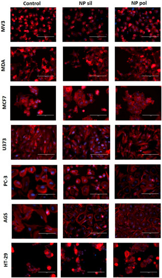 Effects of nanoparticles in tumor cells actin cytoskeleton. Tumor cells were incubated with polymeric (pol) and silica (sil) nanoparticles (20 µg/mL) for 24 h. Filamentous actin was labeled with tetramethylrhodamine (TRITC)-phalloidin and nuclei were stained with 4,6-diamino-2-phenylindole (DAPI). Representative images from three individual experiments were captured at 400× magnification.