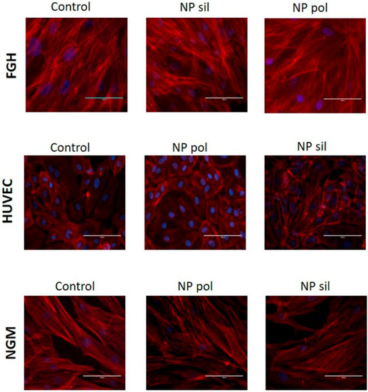 Effects of nanoparticles in non-tumor cells actin cytoskeleton. FGH, HUVEC and NGM cells were incubated with polymeric (pol) or silica (sil) nanoparticles (20 µg/mL) for 24 h. Filamentous actin was labeled with TRITC-phalloidin and nuclei were stained with DAPI. Representative images from 3 individual experiments were captured at 400× magnification.