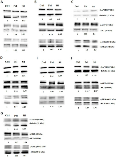 Nanoparticles effects on tumor intracellular signalling. Tumor cells were incubated with polymeric (pol) or silica (sil) nanoparticles (20 μg/mL) for 24 h. Then, cell lysates were immunoblotted with anti-pERK1/2 and anti-ERK1/2, anti-pAKT ser 473 and anti-AKT, anti-GAPDH and anti-tubulin. (A). MV3 (B). MDA-MB-231 (C). MCF-7 (D). U373 (E). PC-3 (F). AGS (G). HT-29. Results are presented as the mean ±SD calculated from three independent experiments (* p < 0.05).