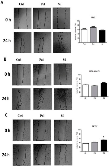 Cells (2 × 105 cells) were seeded in 24-well plates and allowed to attach for 24 h. Wounds were created in confluent cells using a pipette tip. Cells were then rinsed with medium to remove floating cells and debris. Before treatment, cells were incubated or not with Mitomicin C (5 µg/mL) for 1 h. After washing, cells were treated in the presence or absence of nanoparticles (20 µg/mL) for another 24 h. The culture plates were incubated at 37 °C. Wounds were measured at 0 and 24 h. The percentage of wound-healing was calculated using the equation: (percentage wound-healing) = average of ([gap length: 0 h]-[gap length: 24 h])/[gap length: 0 h]).