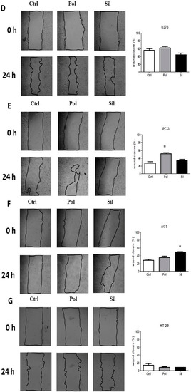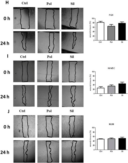Effects of nanoparticles in tumor and non-tumor cells migration. Tumor cells ((A). MV3 (B). MDA-MB-231 (C). MCF-7 (D). U373 (E). PC-3 (F). AGS (G). HT-29) and non-tumor ((H). FGH, (I). HUVEC, (J). NGM) cells were cultured for 24 h in the absence (ctrl) or in the presence of 20 ug/mL of polymeric (Pol) or silica (Sil) nanoparticle. Mean e standard variation were calculated from 3 individual experiments (* p < 0.05).