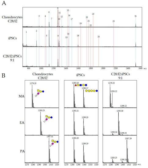 iPSCs (606A1) and chondrocytes (C28/I2) were cultured with each other until 80% confluent. Cultured cells were washed three times with phosphate-buffered saline (PBS), detached with a cell scraper, and collected in a centrifuge tube. Viable cells were stained with Trypan Blue (Invitrogen), and the number of cells was counted using a Countess Automated Cell Counter (Invitrogen). Next, iPSCs and chondrocytes were mixed at different ratios (iPSC content = 100%, 50%, 30%, 20%, 10%, 5%, 2.5%, and 0%; total cells = 1 × 106). Mixed cells were centrifuged at 440 g for 5 min and the supernatant was aspirated. After rinsing with 1000 μL PBS and centrifuging at 800 g for 5 min, 100 μL cultured cells in PBS were homogenized using a BIORUPTOR II instrument (CosmoBio, Tokyo, Japan) at 4 °C, followed by addition of a 4-fold volume of ethanol in the cell lysate. After ethanol precipitation, the resulting mixtures were centrifuged at 14,000 g for 20 min. Supernatants containing glycosphingolipids (GSLs) were recovered and concentrated with a centrifugal evaporator. The lipid fraction was resuspended in 50 mM acetate buffer, pH 5.5 (48 μL), containing 0.2% Triton X-100 (Sigma-Aldrich, Tokyo, Japan) as a surfactant, followed by the addition of 2 μL endoglycosylceramidase (EGCase) I (25 mU) to release intact glycans from GSLs, as previously described [13,22]. Prepared GSL-glycans were subjected to glycoblotting aminolysis-SALSA methods [14]. Briefly, intact GSL-glycans containing internal standards Neu5Ac2Gal2GlcNAc2 + Man3GlcNAc1 (A2GN1) were captured on 5 mg BlotGlyco beads (Sumitomo Bakelite Company Ltd., Tokyo, Japan). Unreacted hydrazide groups on beads were capped by acetylation with 10% acetic anhydride in methanol. Next, 100 μL of the first alkylamidation solution was added to wells containing beads and incubated at room temperature for 1 h with shaking in a microplate mixer (TOMY, Tokyo, Japan). Excess amidation reagents were removed, and beads were washed with 200 μL MeOH. For the aminolysis-SALSA procedure, beads were washed three times with 200 μL of 2.9 M amine reagent (methylamine, ethylamine, or propylamine), MeOH, and water. Finally, capturing GSL-glycans were released from BlotGlyco beads and derivatized with aoWR reagents by an imine-exchange reaction. The recovered solution was applied to a hydrophilic interaction liquid chromatography (Waters, Milford, MA, USA) plate to remove the excess aoWR reagents. The solution containing GSL-glycans was mixed with 2,5-dihydrobenzoic acid solution (10 mg/mL in 30% acetonitrile aq) and subjected to matrix-assisted-laser-desorption/ionization–time-of-flight mass (MALDI-TOF MS) analyses as previously described [12]. Briefly, all measurements were performed on an Ultraflex II TOF/TOF-MS instrument equipped with a reflector and controlled by FlexControl 3.0 software (Bruker Daltonics, Bremen, Germany). All MS spectra were obtained in reflectron mode with an acceleration voltage of 25 kV, a reflector voltage of 26.3 kV, and a pulsed-ion extraction of 160 ns in positive ion mode. Masses were annotated using FlexAnalysis 3.0 software (Bruker Daltonics, Bremen, Germany) and SphinGOMAP (http://www.sphingomap.org/ accessed on 31 October 2019) online databases for structural identification of GSL-glycans.