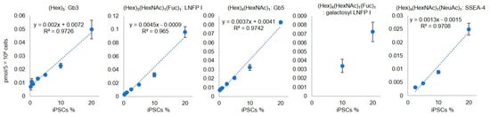 Linear dynamic ranges of the quantification of (Hex)3: Gb3, (Hex)3(HexNAc)1(Fuc)1: LNFP I, (Hex)4(HexNAc)1: Gb5, (Hex)4(HexNAc)1(Fuc)1: galactosyl LNFP I, and (Hex)4(HexNAc)1(NeuAc)1: SSEA-4 at various iPSC ratios (iPSC content = 20%, 10%, 5%, 2.5%, 1%, 0.5%, and 0.25%). Error bars indicate standard deviation (SD) for triplicate measurement.