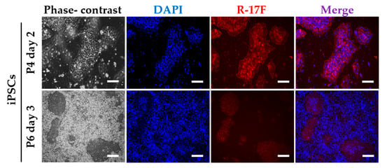 R-17F is an antibody that detects undifferentiated iPSCs by recognizing the LNFP I of GSL, and consequently exerts cytotoxic activity [9]. Therefore, we tried to investigate the removal of residual iPSCs via R-17F-induced cytotoxicity toward co-cultured cells for iPSCs and chondrocytes. Firstly, the binding ability of R-17F to iPSCs was evaluated using immunohistological staining. Cultured iPSCs (606A1, P4, and 207B7, P6) were fixed in 4% paraformaldehyde (PFA) and incubated with R-17F (10 µg/mL) at 4 °C overnight, then incubated with the secondary antibody (Alexa Fluor 594-conjugated goat anti-mouse IgG antibody). The labeling cells were imaged by a fluorescence microscope (BZ-X710, KEYENCE, Osaka, Japan). Figure 3 shows that R-17F bound to all iPSC colonies, as evidenced by the fluorescence signal. In the 201B7 cells, differentiated iPSCs surrounded undifferentiated iPSC colonies, but only undifferentiated iPSC colonies were R-17F-positive. Next, we confirmed the cytotoxicity of R-17F toward either iPSCs or chondrocytes. After incubation of either iPSCs or chondrocytes (C28/I2) with R-17F at a concentration of 100 μg/mL for 45 min, propidium iodide (PI)-positive (dead) cells were quantified by flow cytometry. The cytotoxic activity of R-17F against iPSCs was estimated to be >70%, compared with only 38% for control iPSCs, as shown in Figure 4. In sharp contrast with iPSCs, PI-positive cells showed almost no differences between R-17F-induced chondrocytes (15%) and controls (13%). R-17F exerted a specific cytotoxic effect against iPSCs, but not chondrocytes. We also evaluated the cytotoxicity of R-17F against iPSC colonies. After incubation with 500 μg/mL of R-17F for 24 h, necrosis of colonies was confirmed by microscopy (Figure S4).