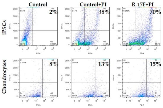 Evaluation of the cytotoxicity of R-17F against iPSCs and chondrocytes. Both iPSC (606A1) and chondrocyte (C28I2) cell lines were treated with R-17F, stained with PI, and analyzed by flow cytometry.