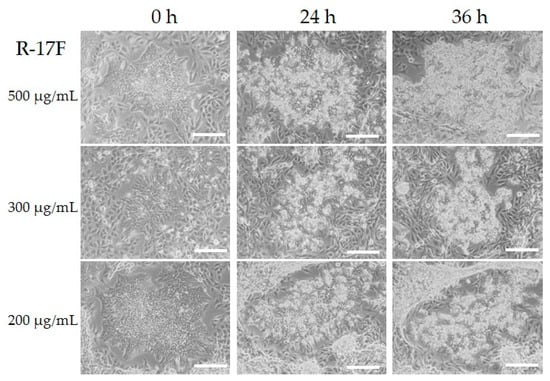 Images of iPSC colonies and chondrocytes (C28/I2) after treatment with R-17F at various concentrations. iPSCs and chondrocytes (C28/I2) were cultured for 3 days, followed by adding R-17F at the concentration of 200–500 μg/mL. All cells were monitored under a microscope. Scale bar = 500 μm.