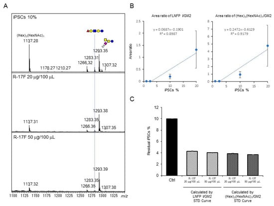 MALDI-TOF MS analysis of GSL-glycans from co-cultured cells (chondrocytes and iPSCs) treated with R17-F antibody. (A) MALDI-TOF MS spectra of co-cultured cells and antibody-treated cells. (B) Linear dynamic ranges of LNFP I/GM2 and (Hex)3(HexNAc)1/GM2 area ratios at different iPSC co-cultured conditions (iPSC content = 20%, 10%, 2.5%, and 1%). (C) Evaluation of residual iPSCs co-cultured with chondrocytes. The residual iPSC percentage was calculated using calibration curves. Error bars indicate standard deviation (SD) for triplicate measurement.