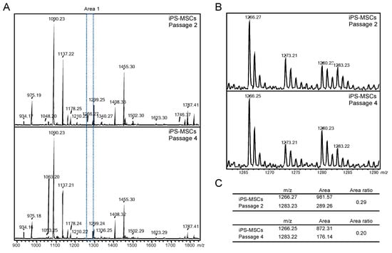 (A) MALDI-TOF MS spectra of GSL-glycans in passage 2 and 4 iPS-MSCs. (B) Close-up views in Area 1. (C) The area ratio of m/z 1283 and m/z 1266 in passage 2 and 4 iPS-MSCs.