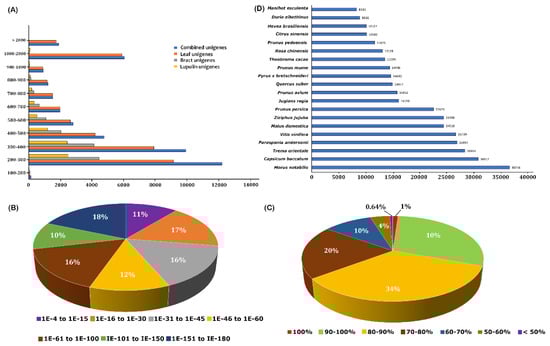 To understand the putative gene functions of hop transcriptomes in the context of systems biology, all assembled unigenes were subjected to annotation using BLAST searches against several public databases. The BLASTx annotation results showed that 30,996 (71.17%) unigenes had significant similarity with protein sequences in the nr database at E-value cut-off of 1 × 105, whereas, small proportion of sequences (12,554 unigenes, 28.83%) was unannotated and did not exhibit significant homology with sequences in the nr database, which might represent novel, non-protein-coding hop specific transcripts or could be derived from 3′ or 5′ untranslated regions (UTR) of the less conserved genes. The E-value distribution of unigenes annotated to the nr database showed that approximately 10.89% of unigenes mapped in the range of 1 × 105 to 1 × 10100 (Figure 3B). The similarity distribution illustrated that the majority of unigenes (99.36%) had homology between 50% and 100%, whereas only 0.64% of the unigenes with homologous sequences had similarities less than 50% (Figure 3C). These results reflected the high homology match of the mapped sequences with known sequences, suggesting the high quality of assembled transcripts. Furthermore, sequence homologies of assembled unigenes showed that 36,716 of total unigenes were matched to sequence from Morus notabilis (84.30%), followed by Capsicum baccatum (70.99%), Trema orientale (65.33%), Parasponia andersonii (61.99%), and Vitis vinifera (61.39%) (Figure 3D).