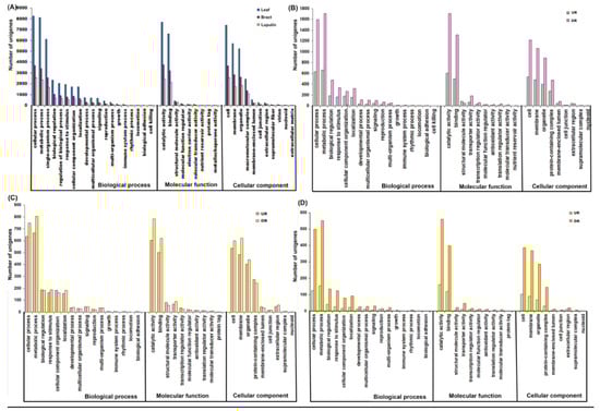 Comparison of Gene Ontology (GO) classifications of combined and tissues-specific unigenes (A) differentially expressed genes in bract compared to leaf (B), lupulin glands compared to bract (C) and lupulin glands compared to leaf (D). The results are summarized in three main categories: Biological process, Cellular component, and Molecular function. The x-axis indicates subcategories; right y-axis indicates number of genes in a category. UR: up-regulated, DR: down-regulated.