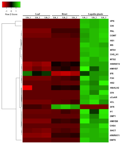 Heat map and complete linkage hierarchical clustering analysis of relative expression levels of differentially expressed secondary metabolite genes involved in important secondary metabolite biosynthesis. Colors on vertical represent the clustered genes based on gene expression, the horizontal line represents the single gene and color of the line indicates the average gene expression in libraries of leaf, bract, and lupulin glands. The signal ratios were shown in a black-green color scale, where green indicated high expression level and black indicated low expression level. COMT: caffeic acid 3-o-methyltransferase; 4CL: 4-coumarate:CoA ligase; cCoAR: cinnamoyl-CoA reductase; MTS2: myrcene synthase; HS2: humulone synthase 2; CHI: chalcone isomerase; VPS: valerophenone synthase; CHS_H1: chalcone synthase; PAL: phenylalanine ammonia-lyase; MTS1: monoterpene synthase 1; SHCT: shikimate o-hydroxycinnamoyltransferase; OMT5: O-methyltransferase 5; I3′H: isoflavone 3′-hydroxylase; OMT1: O-methyltransferase 1; MS: myrcene synthase; HS1: humulone synthase 1; CHS4: chalcone synthase 4; F3H: flavonol synthase/flavanone 3-hydroxylase; DFR: dihydroflavonol 4-reductase; IFR: isoflavone reductase-like protein; PT: prenyltransferase. The color scale (−2 to 2) is shown on the left; red represents low content, green represents high content.
