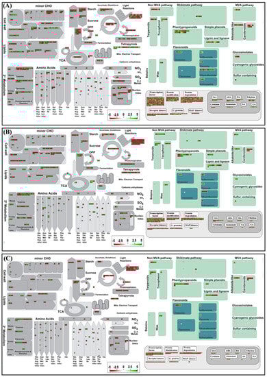 Overview of the MapMan visualization of differentially expressed genes in three stages. (A) bract compared to leaf, (B) lupulin glands compared to bract, and (C) lupulin glands compared to leaf. The log2 fold changes of significantly differentially expressed genes were imported and visualized in MapMan. Red and green displayed signals represent a decrease and an increase in transcript abundance, respectively in the pairwise comparison sets of the three stages. The scale used for coloration of the signals (log2 ratios) is presented.