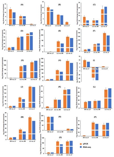 Validation of expression patterns of differentially expressed genes by RT-qPCR. Graph showing fold change of the structural genes, regulatory genes and two randomly selected genes in the pairwise comparison sets of the three stages, namely, bract compared to leaf (BR vs. LF), lupulin glands compared to bract (LG vs. BR) and lupulin glands compared to leaf (LG vs. LF). (A) PAL: phenylalanine ammonia lyase; (B) 4CL: coumarate coenzyme A ligase; (C) C4H: cinnamate 4-hydroxylase; (D) CHS_H1: chalcone synthase isoform 1; (E) OMT1: O-methyltransferases isoform 1; (F) PT1: prenyltransferase 1; (G) VPS: valerophenone synthase; (H) CHS4: chalcone synthase isoform 4; (I) DFR: dihydroflavanol reductase; (J) CHI: chalcone isomerase; (K) bHLH2 transcription factor; (L) HlWRKY1 transcription factor; (M) HlMYB8 transcription factor; (N) ERT: ethylene-responsive transcription factor ERF017; (O) SHCT: shikimate o-hydroxycinnamoyltransferase; (P) HlMYB8 transcription factor. qRT-PCR analyses were normalized using DEAD-box ATPase-RNA-helicase (DRH) as an internal control gene. The fold change of each gene was calculated by the 2−ΔΔCT method. Data were means ± standard deviations (SD) of three biological replicates.