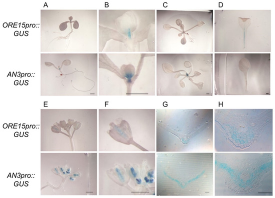 AN3/GIF1 was strongly expressed in the proximal region of the leaf during the cell proliferation stage (Figure 1A–C), which is consistent with previous findings [9]. AN3 was also expressed in the carpels of both young and mature flowers (Figure 1E,F). ANT, another important regulator of cell proliferation, has been reported to be expressed in active cell proliferation regions including young leaf blades, veins of leaves and stems, pistils, and meristems [26]. A study of GRF1 and GRF4, which were direct downstream targets of ORE15 [25], also showed very similar expression patterns to those of ORE15 [9,27]. To compare the expression domains of ORE15 and AN3/GIF1 in detail, we conducted histochemical analysis of GUS-stained leaves of transgenic plants. An examination of transverse sections of cell proliferating leaves of ORE15promoter::GUS transgenic plants showed that ORE15 was expressed strongly in the abaxial parenchyma cells around midvein in the proximal region of the leaf blade (Figure 1B,D,G,H). Transverse sections of GUS-stained leaves from AN3promoter::GUS transgenic plants showed that AN3 was expressed in mesophyll cells in the proximal region of the leaf blade of young leaves (Figure 1G,H), which was consistent with a previous report [17]. These results indicate that spatiotemporal expression patterns of ORE15 partially overlap with those of AN3/GIF1 in the abaxial parenchyma cells around midvein in the proximal region of the leaf blade. Together, these expression findings supported the idea of genetic interaction between the ORE15 and GRF–GIF complex, especially AN3/GIF1, GRF1, and GRF4 in the regulation of cell proliferation.