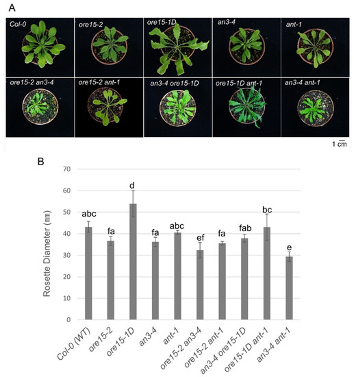 Plant morphology and rosette diameter of the Arabidopsis Columbia-0 (Col-0) wild type (WT), single loss of function (LOF) and gain of function (GOF) mutants. (A) Plant phenotypes of the ore15-2, ore15-1D, an3-4, ant-1, and combined double mutants, ore15-2 an3-4, ore15-2 ant-1, an3-4 ore15-1D, ore15-1D ant-1, and an3-4 ant-1 at 35 DAS. ore15-2 (SALK_029507) is a T-DNA insertional mutant and ore15-1D is a dominant mutant isolated from activation tagging lines, in which T-DNA was inserted in the first intron and 3′ UTR of ORE15, respectively. an3-4 has a large deletion in the AN3 locus and ant-1 has a 22-nucleotide deletion in the second exon of the ANT locus. Scale bar = 1 cm. (B) The widest diameter of rosette leaves. Data are means ± standard error (SE) (n = 5). Means were compared using one-way analysis of variance (ANOVA) followed by Duncan’s multiple range test. Different lowercase letters indicate significantly different means between genotypes.