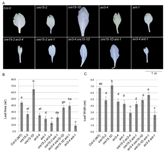In this study, the ore15-1D and ore15-2 mutants produced larger and smaller leaves, respectively, than the Col-0 (Figure 2 and Figure 3), consistent with the findings of our previous study [25]. Kinematic analysis of leaf growth showed a higher rate of cell proliferation in ore15-1D in early stage of leaves compared with those in Col-0 [25]. Anatomical analysis also showed that ORE15 mediated the cell proliferating phase of early stage in leaf growth [25].