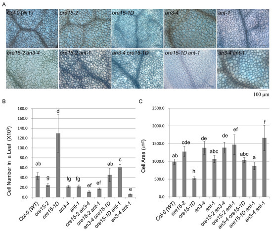 Leaf growth is regulated by cell proliferation and cell expansion [28,29]. As previously reported, ORE15 promotes leaf growth by enhancing the rate and duration of cell proliferation. In our previous study, the ore15-2 an3-4 double mutant produced significantly smaller leaves and cell numbers, indicating a composite regulatory interaction between ORE15 and AN3/GIF1 in the regulation of leaf growth [25].