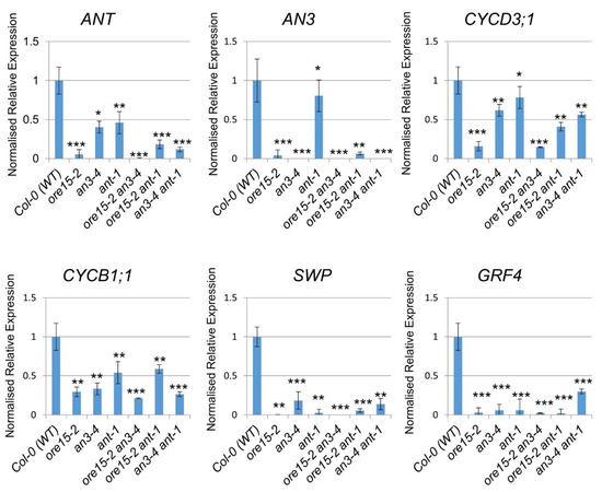 Cyclin B1;1 (CYCB1;1) expression was reduced in all mutants compared with Col-0, although differences were detected in the extent of reduction (Figure 5). CYCD3;1 expression was greatly reduced in ore15-2, ore15-2 ant-1, an3-4 ant-1, and ore15-2 an3-4 LOF double mutants, indicating that ORE15 and the ANT pathway coordinate to regulate cell proliferation. GRF4 expression was also greatly reduced in all single and double mutants compared with Col-0 (Figure 5), supporting a relationship between ORE15 and the GRF–GIF. The expression of STRUWWELPETER (SWP), which encodes a protein similar to subunits of the mediator complex [33], was greatly reduced in all single and double mutants compared with Col-0 (Figure 5), indicating that SWP might have an important role in cell proliferation regulation during leaf growth.