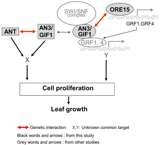 A working model of the genetic interaction between ORE15, AN3, and ANT for cell proliferation regulatory pathway during leaf growth. Two functionally redundant parallel pathways might converge on common nodes, by regulating unknown target X, Y genes.