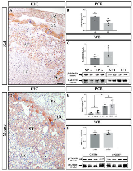 Rarres2 expression in rat and mouse placenta. (A–C) Rat placenta, (D–F) mouse placenta. (A,D) Immunohistochemical (IHC) stains of methyl Carnoy-fixed placental paraffin sections. Abbreviations: GC = giant cell, BZ = basal zone, ST = spongiotrophoblast, LZ = labyrinth zone, star = glycogen cells. The bar equals 100 µm. (B) Maternal protein restriction rat model: placental Rarres2 mRNA expression on E18.5 (ns: p = 0.89, Mann-Whitney U-Test, n = 4 NP/LP dams with 6 pups each). E) eNOS−/− mouse model: placental Rarres2 mRNA expression on E15 and E18.5 (E15: ns: p = 0.31, E19: ns: p = 0.66, Mann-Whitney U-test, WT: n = 5 dams, eNOS−/−: n = 6 dams with 2 pups each). C + F) Analysis of Rarres1 protein expression versus β-Tubulin housekeeper by Western blotting (WB, Rat: ns: p = 0.10, Mann-Whitney U-Test, n =4 NP/LP dams with n = 2 pups each, E18.5; Mouse: ns: p = 0.49, Mann-Whitney U-Test, n = 4 C57B6 and eNOS−/− dams per group with n = 1 pup each, E18.5). Abbreviations: LP = low protein diet, NP = normal protein diet in the rat IUGR model with m = male fetus, f = female fetus; C57B6 = C57BL/6 wild type (WT) control strain, eNOS−/− = PE/IUGR model eNOS knockout mouse, ns = not significant.