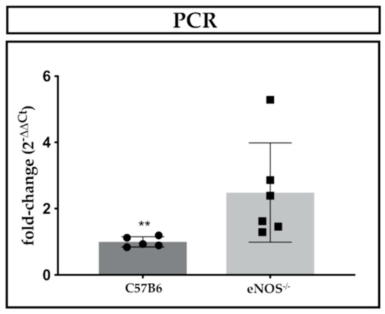 Placental IL-11 mRNA expression in eNOS−/− mice on E15. (** p = 0.004, Mann-Whitney U-test, WT: n = 5 dams, eNOS−/−: n = 6 dams with 2 pups each) Abbreviations: C57B6 = C57BL/6 wild type (WT) control strain, eNOS−/− = PE/IUGR model knockout mouse.