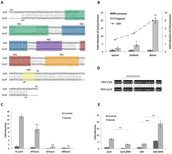 Evaluation of Car9 promoter activity under different conditions. (A) In silico analysis and comparison of the nucleotide sequence (from −200 to +50) of human (CA9) and mouse (Car9) promoters. Putative protected regions (PRs) and hypoxia-responsive elements (HRE) are highlighted in colors. The transcription start site is marked as▼. (B) Reporter gene analysis of pGL3-Car9 full length (FL) construct (−191/+47) transfected into HeLa cells. Transfected cells were plated in sparse (10,000 cells/cm2), medium (40,000 cells/cm2), and dense (80,000 cells/cm2) cultures. At the same time, the activity of the human pGL3-CA9 promoter was analyzed and is expressed as a fold induction (ratio of promoter activity in hypoxia to normoxia). (C) Comparison of pGL3-Car9 FL construct with pGL3-Car9 constructs with mutated binding sites for selected transcription factors: AP1 (AP1mut), SP1 (SP1mut), and HIF-1 (HREmut). (D) Alignment of human (CA9) and mouse (Car9) PR4 sequences. The repressor-binging sequence within the CA9 promoter is marked with a line. (E) Deletion of the PR4 sequence from either mouse (Car9 ∆PR4) or human (CA9 ∆PR4) promoter and the impact on the reporter activity. (B–D) 24 h after incubation in either normoxic or hypoxic conditions, transfected cells were lysed and analyzed for promoter activity by the Dual-Luciferase Reporter Assay System. Luciferase activity was normalized against Renilla activity. Hypoxic values are expressed as fold induction of the normoxic ones. Data are expressed as means ± SD (error bars), n = 3 experiments, * p < 0.05, ** p < 0.01, *** p < 0.001.