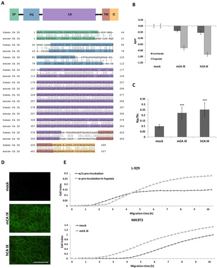 Functional analysis of mouse carbonic anhydrase (mCA IX). (A) Domain composition of the CA IX protein relative to the human and mouse CA IX amino acid sequence portrayed below. SP—signal peptide, PG—proteoglycan-like domain, CA—catalytic domain, TM—transmembrane region, IC—intracellular tail. (B) mCA IX-mediated acidification of the extracellular pH in hypoxia. Extracellular pH was measured in MDCK cells transfected with either mouse CA IX (MDCK-mCA IX) or human CA IX (MDCK-hCA IX). Control cells were transfected with an empty vector (MDCK-mock). Transfected cells were maintained in normoxia or exposed to hypoxia for 48 h. The graph shows differences in pHe values (∆pH) ± SD from three independent experiments. (C) Analysis of the impact of ectopic expression of mCA IX on cell–cell adhesion via dissociation assay. Analogous to hCA IX-expressing MDCK cells, mCA IX-expressing MDCK cells displayed a significantly higher level of dissociation than MDCK-mock cell (p < 0.001). The degree of dissociation was calculated as a ratio between the number of dissociated particles (Np) and number of cells (Nc). Mock-transfected MDCK cells served as a negative control. Data are expressed as means ± SD (error bars), n = 3 experiments, * p < 0.05, ** p < 0.01, *** p < 0.001. (D) Immunofluorescence of MDCK cells transfected with either mCA IX or hCA IX revealed CA IX-specific plasma membrane staining. Mock transfected cells served as a negative control. Scale bar 50 μm. (E) Effect of either natural (L-929 cells pre-incubated in hypoxia) or ectopic (NIH3T3 cells transfected with pSG5C-Car9) mCA IX expression on cell migration analyzed by xCELLigence real-time cell analyzer. Cells were added in quadruplicates to the upper chambers of the CIM-plate. Migration is expressed as cell index representing relative change in impedance monitored every 15 min for 10 h.