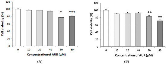 Effects of treatment with auraptene (AUR) on C6 cell viability in medium containing 10% fetal bovine serum (FBS) (A) or 2% FBS (B). Cells were treated with various concentrations (0–80 μM) of AUR for 24 h. The results are presented as the mean ± SEM (n = 4). Significance difference in values between the non-treated (0 μM) and AUR-treated cells: * p < 0.05; ** p < 0.01; *** p < 0.001.