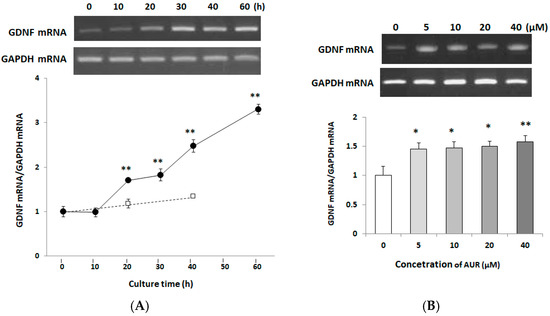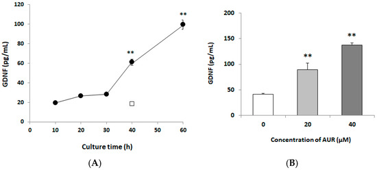 Effects of treatment with AUR on glial cell line-derived neurotrophic factor (GDNF) content in the medium of C6 cells. (A) Cells were incubated with 10 μM AUR for various times (10–60 h) (●) or without AUR for 40 h (□). Significance difference in values between the non-treated cells (40 h) and other cells: ** p < 0.01; (B) Cells were incubated with various concentrations (0, 20, and 40 μM) of AUR for 40 h. Significance difference in values between the non-treated (0 μM) and AUR-treated cells: ** p < 0.01. In (A) and (B), the results are presented as the mean ± SEM (n = 4).