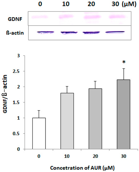 To examine the effect of treatment with AUR on GDNF expression in C6 cells, we treated them with various concentrations (0, 10, 20, and 30 μM) of AUR for 40 h. The results of immunoblot analysis (Figure 3) showed that the GDNF content in the control cell lysate was low but that significant induction occurred after 40 h of treatment with 30 μM AUR (* p < 0.05).
