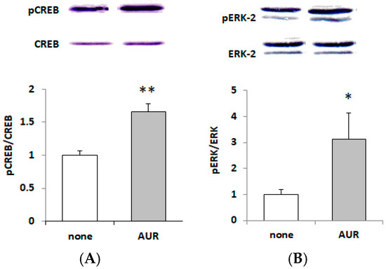 Effects of treatment with AUR on phosphorylation of cAMP response element-binding protein (CREB) (A) and extracellular signal-regulated kinase 2 (ERK2) (B) in C6 cells. Cells were incubated with 20 μM AUR for 40 h. The density ratio of phosphorylated components to total components of untreated cultures (none) was expressed as 1.0. The results are given as the mean ± SEM (n = 3). Significance difference in values between the none-treated and AUR-treated cells: * p < 0.05; ** p < 0.01.