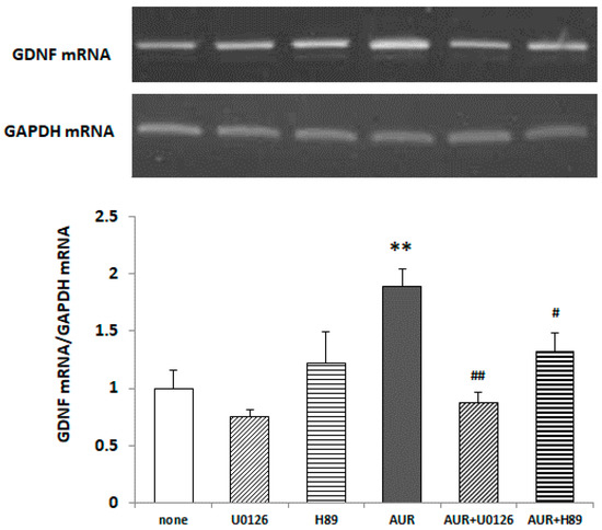 In PC12 cells, the Ca2+-induced nuclear translocation of ERK to the nucleus requires protein kinase A (PKA) activation [25]. So we pretreated C6 cells with 1 μM H89 (a specific inhibitor of PKA) for 30 min and subsequently treated them with 20 μM AUR for 40 h. Figure 6 shows that AUR-induced GDNF mRNA expression was significantly (# p < 0.05) inhibited by H89, indicating that the action of AUR on GDNF synthesis in astrocytes was mediated in an ERK/PKA/CREB-dependent manner. Figure 6 also shows that there was no effect of either inhibitor tested alone on the basal level of GDNF mRNA.