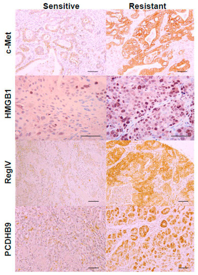 Expression of the four metastasis-related genes in CDDP-sensitive and CDDP-resistant cases. Expression levels of c-Met, HMGB1, RegIV, and PCDHB9 were examined by immunohistochemistry in CDDP-sensitive and -resistant cases. Scale bar, 50 μm.