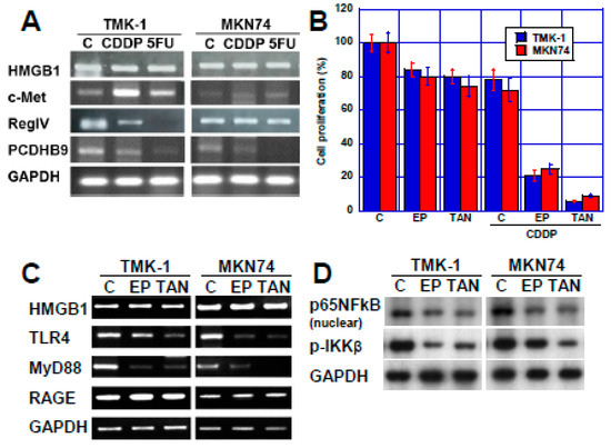 As described above, HMGB1 showed the strongest correlation with CDDP responsiveness among the four genes examined this study. Since it was considered that CDDP sensitivity can be promoted by inhibiting HMGB1, we examined the effect of EP and TAN in two types of human gastric cancer cell lines, TMK−1 and MNK74 (Figure 3). First, alteration in the expression of the four genes in the two cell lines treated with CDDP or 5-FU were examined (Figure 3A). The gene expression level of c-met increased, while that of RegIV and PCDHB9 decreased upon treatment with anticancer drugs; in contrast, no obvious change was observed in HMGB1 expression.