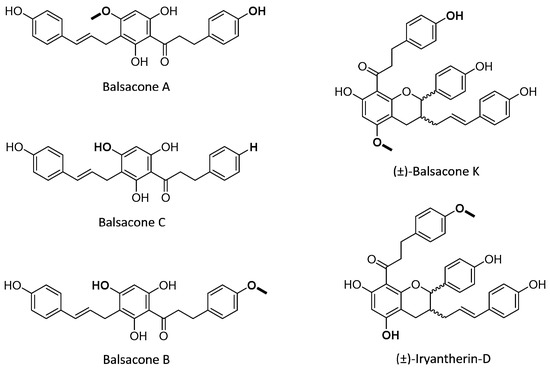 The compounds of Populus balsamifera L. buds, BA, BB, BC, BK, and BD, were isolated by the LASEVE as previously described [24,26]. Quantitative 1H nuclear magnetic resonance (NMR) spectroscopy was performed to determine the structure of isolated balsacones and to confirm their purity. For all isolated balsacones, the purity obtained was over 95% in order to ensure that the observed effect is accurate and not related to highly active impurities present in the tested samples. The structures of these compounds, isolated as racemates, are given in Figure 1.