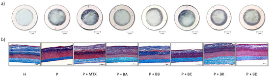 Macroscopic and histological analyses with Masson’s trichrome staining demonstrate the differences between H and P substitutes reconstructed in vitro (Figure 2). Macroscopic analyses confirmed the integrity of skin substitutes reconstructed according to the self-assembly method (Figure 2a). Macroscopic photos of H substitutes allow us to observe the epidermis which is opaque, smooth, and uniform, covering the entire seeding area, and thus, demonstrating the normal proliferation and differentiation of keratinocytes. Macroscopic photos of P substitutes show excessive proliferation and the early differentiation of keratinocytes since some areas of the epidermis are whitish, meaning there is a greater number of cornified cells. Histological analyses showed that P substitutes have a thicker living epidermis than H substitutes (Figure 2b). P substitutes treated with one of the five compounds (BA, BB, BC, BK or BD) or MTX, used as a control treatment for comparison, seem to have a living epidermis thickness comparable to the H substitutes.