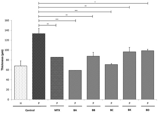 The effects of the different treatments on epidermal morphogenesis were studied by comparing the thickness of the different tissues at day 21 of the air–liquid interface (A/L), because tissue culture during 21 days at A/L promotes and ensures a full differentiation and stratification of the epidermis. Living epidermis thickness was measured from the histological analyses (Figure 2b). The thickness of psoriatic living epidermis was found to be significantly thicker compared with the healthy living epidermis (P: 133 ± 10 μm, H: 68 ± 10 μm, p < 0.001) (Figure 3). The epidermis thickens due to keratinocyte hyperproliferation. However, when treated with either the standard treatment MTX or BA, BB, BC, BK or BD, there was a significant reduction in the thickness of the living epidermis of P substitutes (P + MTX: 85.53 ± 0.04 μm, P + BA: 59.02 ± 0.06 μm, P + BB: 88 ± 8 μm, P + BC: 71 ± 2 μm, P + BK: 96 ± 9 μm, P + BD: 99 ± 3 μm vs. P: 133 ± 10 μm) (Figure 3), and a better keratinocyte differentiation compared with the untreated P substitutes, as seen in Figure 2b. For the H substitutes, no significant differences were observed between the untreated and the treated skin models (Supplementary Figure S1).