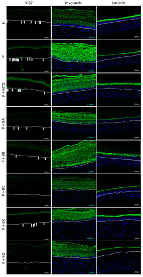 The stainings of IVL, an early differentiation marker, and LOR, a late differentiation marker, were performed to evaluate the differentiation process. As can be observed in Figure 4, the early differentiation marker (IVL) is overexpressed in P substitutes (without treatment), while the late differentiation marker (LOR) is underexpressed, compared with H substitutes. When treated either with the standard treatment MTX or with BA, BB, BC, BK or BD, the expression of IVL and LOR seems partially or fully restored, suggesting a normalization of the differentiation process. The fluorescence intensity analyses of microscopy images have confirmed an increase in pixel intensity for LOR of over 100% when P substitutes were treated with BB or BK, compared with untreated P substitutes, while MTX treatment increased the presence of LOR up to 66% compared with the control. The pixel intensity of IVL, when substitutes were treated with MTX, decreased to 41% compared with untreated P substitutes, while BA and BC treatments led to a fully restored IVL expression as found in a healthy phenotype. Treatments with BK, BB or BD revealed a partial expression of IVL (respectively an 89%, 40%, and 12% decrease in pixel intensity compared with P substitutes), suggesting that P substitutes treated with one of BA, BB, BC, BK or BD are closer to a healthy phenotype. According to these analyses, BA, BB, BC, and BK seem to act even better than MTX on the differentiation process.