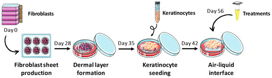 In vitro reconstructed H and P skin substitutes were produced according to the partially modified self-assembly method (Figure 5) [31,34]. Briefly, human dermal fibroblasts at their sixth passage were seeded (8 × 104 cells/well) in 6-well cell culture plates, and cultured in the Dulbecco-Vogt modification of Eagle’s medium (DMEM) supplemented with 10% fetal calf serum (FCS; Invitrogen, Burlington, Ontario, Canada), 50 μg/mL ascorbic acid (Sigma, Mississauga, Ontario, Canada), 100 UI/mL penicillin G (Sigma, Oakville, Ontario, Canada) and 25 μg/mL gentamicin (Schering, Pointe-Claire, Québec, Canada) until they formed manipulatable sheets. Then, these sheets were superimposed and incubated to form a new dermal layer. After this period, in order to form an epidermal layer, keratinocytes at their third passage were seeded (1 × 106 cells/well) on the dermal layer and substitutes were cultured in submerged conditions to promote keratinocyte proliferation. Keratinocytes were cultured in a combination of DMEM and Ham’s F12 (3:1), supplemented with 5% Fetal Clone II serum (Hyclone, Scarborough, Ontario, Canada), 50 μg/mL ascorbic acid (Sigma), 5 μg/mL insulin (Sigma), 0.4 μg/mL hydrocortisone (Calbiochem, EMD Biosciences, Gibbstown, NJ, USA), 10−10 M cholera toxin (MP Biomedicals, Montréal, Québec, Canada), 10 ng/mL human epidermal growth factor (EGF; Austral Biological, San Ramon, CA, USA), 100 UI/mL penicillin G (Sigma) and 25 μg/mL gentamicin (Schering). Seven days later, skin substitutes were raised to the A/L, and further cultured for 21 days with culture medium exempt of EGF to obtain a stratified epithelium representative of in vivo skin. To treat the H and P skin substitutes, dilutions of the stock solutions were prepared in culture medium at day 14 of the A/L. These dilutions were added directly to the petri dish with the skin substitutes. H and P skin substitutes were treated every two days throughout the week with the diluted compounds. To administer a typical starting dose of MTX for treating severe psoriasis (10 to 25 mg per week), 6.67 mg of solution for injection was added directly to the fresh cultured medium (734 μM), every two days throughout the week. Then, samples of each skin substitute condition at day 21 of A/L were taken, and they were analyzed by histology and immunofluorescence staining. Both cell types were maintained at 37 °C in an incubator containing 8% carbon dioxide (CO2) and culture medium was refreshed three times a week. Experiments were performed in triplicate in three independent assays (with fibroblasts and keratinocytes from two or three different donors).