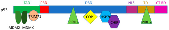 Schematic representation of interaction of p53 with different E3 ligases. Legend: TAD, transactivation domain; PRD, proline rich domain; DBD, DNA binding domain; NLS, nuclear localization signal; TD, tetramerization domain; CT RD, C terminal regulatory domain.