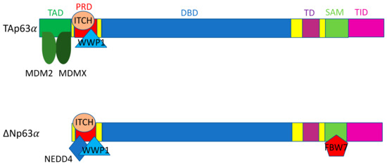 The WW domain containing E3 ubiquitin protein ligase 1 (WWP1) is an E3 ligase that contains a C terminal catalytic HECT domain and WW domains for protein–protein interaction, similarly to Pirh2 and NEDD4 [213]. WWP1 is able to both bind and ubiquitinate TAp63α and ∆Np63α for proteasomal degradation (Figure 2) [213]. In two non-tumorigenic breast epithelial cell lines, MCF10A and 184B5, WWP1 knockdown via siRNA caused an increase in ∆Np63α levels and conferred resistance to doxorubicin induced apoptosis in MCF10A cells [213]. On the flip side, in the HCT116 colon cancer cell line, stabilization of TAp63α was observed upon knocking down WWP1 via siRNA, and sensitized cells to both doxorubicin and cisplatin treatment in a p53-independent manner [213]. Given the fact that the ∆N isoforms of p63 can function as dominant negative inhibitors of p53 and the TA isoforms of p63, these results suggest that WWP1 may act as both an oncogene and tumor suppressor, at least in part, depending on the balance between ∆Np63 and TAp63 in the cells [213]. Following this line of reasoning, WWP1 is known to be overexpressed in types of prostate and breast cancer, but WWP1 also functions as an E3 ligase for several oncogenic substrates as well [212,233,234]. WWP1 has also been observed to heterodimerize with WWP2 to degrade ∆Np73 upon genotoxic stress, while WWP2 alone has been shown to be able to degrade full length p73 in unstressed conditions [230].