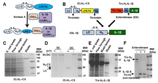 Protein engineering BoNT/D core-therapeutic and targeting ligand. (A) Schematic of the sortase A-mediated conjugation strategy. Sortase A can ligate recombinant (Gly)5-IL-1β or attach (Gly)3-CGRP8-37 to the C-terminal of LC.HN/D via recognition of the LPETG motif and cleavage of the bond between T and G. (B) Illustration of protein engineering /DIL-1β via ligation of Gly5-IL-1β to /D∆HC-CS by sortase A. /D∆HC–CS depicts BoNT/D core-therapeutic with a C-terminal sortase and thrombin recognition motifs (see Methods). Trx: thioredoxin; H6: His6 tag; CS, C-terminal sortase motif. The red bold bar between HN and IL-1β denotes a short peptide sequence consisting of LPETG and non-structural linkers located on each end (see Methods). (C) /D∆HC-CS was expressed in Escherichia coli and purified by IMAC. Aliquots from IMAC were analyzed by SDS-PAGE followed by Coomassie staining. (D) /D∆HC-CS SC and thrombin-nicked di-chain (DC) were subjected to SDS-PAGE followed by Coomassie staining. (E) Purification of Trx-H6-IL-1β fusion protein by IMAC. (F) SDS-PAGE analysis of Trx-H6-IL-1β protein with or without enterokinase treatment. IL-1β and Trx-H6 have similar molecular weights (≈17 kDa).