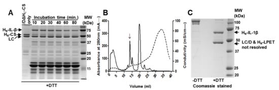 Incubation of enterokinase cleaved product mixture with /DΔHC-CS in the optimized reaction condition; sortase A rapidly ligated IL-1β to /DΔHC-CS within 10 min to yield /DIL-1β conjugated protein. Further incubation did not result in higher yield (Figure 2A). /DIL-1β product was further purified by anion-exchange chromatography (AEX) to remove unbound IL-1β substrate and contaminant present (Figure 2B). The final product was analyzed by SDS-PAGE in the absence or presence of DTT. The majority of /DΔHC-CS was conjugated to IL-1β (Figure 2C, top band in the left lane) with mobility slower than the unconjugated form (Figure 2C, lower band in the left lane). In the presence of DTT, the LC/D and HN/D-IL-1β were separated (Figure 2C), confirming that the inter-chain disulphide bond was not affected by the reaction. The LC/D and sortase A-cleaved HN-LPET in the un-conjugated protein were also segmented in the presence of DTT but not resolved in the SDS-PAGE due to having similar molecular weights (Figure 2C).