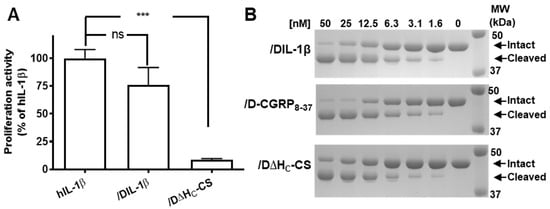 /DIL-1β retains biological activities of its ligand and protease. (A) Bar chart showing RAW cell proliferation activity of /DIL-1β and /D∆HC-CS relative to commercial human IL-1β. Data plotted are mean ± S.E.M. (n = 3). ns: non-significant, *** p < 0.001. (B) /DIL-1β, /D-CGRP8-37 and /D∆HC-CS have similar protease activities regarding cleaving a recombinant GFP-VAMP22-94-His6 substrate.