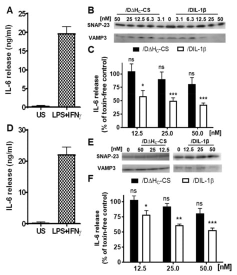 /DIL-1β entered the cultured macrophages, cleaved VAMP3 and inhibited evoked IL-6 release, unlike the untargeted control. (A) Treatment of RAW 264.7 cells with LPS and IFNγ for 42 h induced substantial IL-6 release in comparison to unstimulated (US) cells. (B) Cleavage of VAMP 3 in RAW 264.7 cells by treated proteins was probed by Western blotting using an antibody against VAMP1/2/3 forms. Note that RAW cells predominately express the VAMP3 isoform (Figure S1). It is worth noting that the antibody used only recognises the intact but not the BoNT/D-protease-cleaved form. SNAP-23 was probed as an internal loading control. (C) /DIL-1β and /D∆HC-CS inhibited LPS and IFNγ evoked IL-6 release from the cultured RAW 264.7 cells to different extents. (D–F) Experiments were repeated as for (A–C), except primary mouse macrophage cells were used. Data plotted are mean ± S.E.M. (n = 3). Significance between /DIL-1β or /D∆HC-CS treated cells and toxin non-treated control cells is indicated as follows: non-significant (ns), p > 0.05; * p < 0.05; ** p <0.01 and *** p < 0.001.