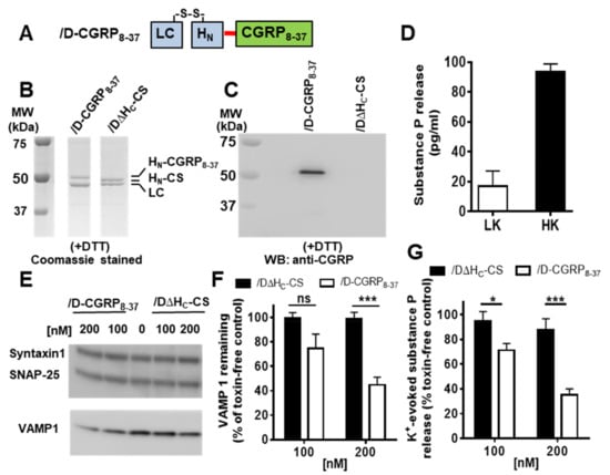 Conjugation of CGRP8-37 to /D∆HC-CS yielded /D-CGRP8-37 which cleaved VAMP1 and inhibited depolarization evoked substance P release from cultured DRGs. (A) Schematic of /D-CGRP8-37. (B, C) DTT reduced /D-CGRP8-37 and /D∆HC-CS samples were analyzed by SDS-PAGE followed by Coomassie staining (B) or by Western blotting with a rabbit anti-CGRP antibody (1:10,000) (C). Uncropped original images are shown in Figure S4. (D) Depolarization of cultured DRGs stimulated the release of substance P approximately 5-fold over basal release (LK, low potassium; HK, high potassium). (E) Representative Western blots showing the cleavage of VAMP1 by /D-CGRP8-37 compared to /D∆HC-CS. Syntaxin1 and SNAP-25 were probed as loading control. (F) Intact VAMP1 remaining after incubating with 100 nM or 200 nM of either protein was calculated by expressing the ratio (intensity of VAMP1/the corresponding internal loading control (Syntaxin1)) as a percentage of the toxin free control sample. (G) /D-CGRP8-37 but not/D∆HC-CS attenuated the K+-evoked substance P release when compared to the toxin-free sample. Data plotted in (D,F,G) are mean ± S.E.M. (n = 3). ns: non-significant, * p < 0.05 and *** p < 0.001.