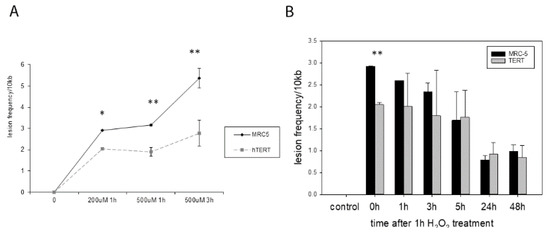 2 for 1 h generated a significantly different amount of mtDNA damage in the two cell types when analysed immediately after the treatment (0 h,