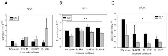 hTERT overexpression could improve resistance against initial mtDNA damage we analysed the gene expression of different antioxidant enzymes such as GPX3, SOD1 and SOD2 under control conditions (medium containing 10% FCS), 3 h serum free medium (SFM) used for the H