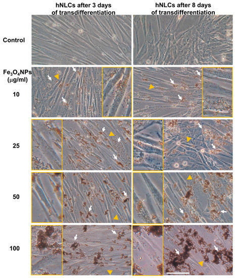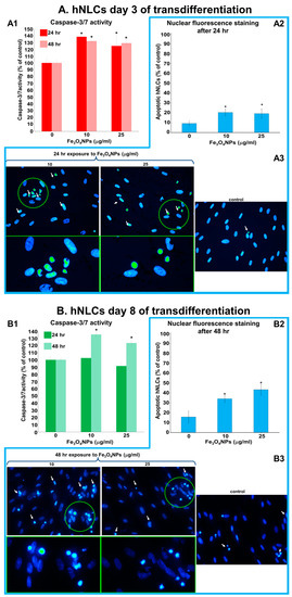 - Apoptosis induced by low concentrations of Fe3O4NPs (i.e., 10 and 25 µg/mL) was confirmed by the elevation of caspase-3/7 activity and nuclear staining. The effects appeared early (24 h) on 3-day-differentiated hNLCs, and later (at 48 h) on 8-day-differentiated cells, suggesting a more susceptible of the immature hNLCs than the full differentiated cells.