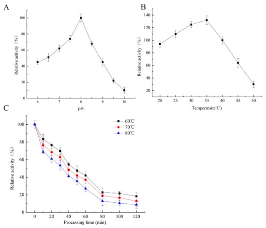 Early studies have indicated that YlLip2 showed higher lipase activity in the range of pH 7.5–8.5 and 35–40 °C [10,11,12]. Thus, the relative activities of the mutational YlLip2 at 40 °C in different pH (6.0–10.0) Tris-HCl buffers were measured via the above method. Analogously, the relative activities of mutational YlLip2 in pH 8.0 Tris-HCl buffer from 20 to 50 °C were determined in the same way. Furthermore, the samples were preincubated at 60, 70, and 80 °C for different times and residual activities were measured to confirm the thermostability of mutational YlLip2. All experiments were performed in triplicate.